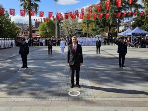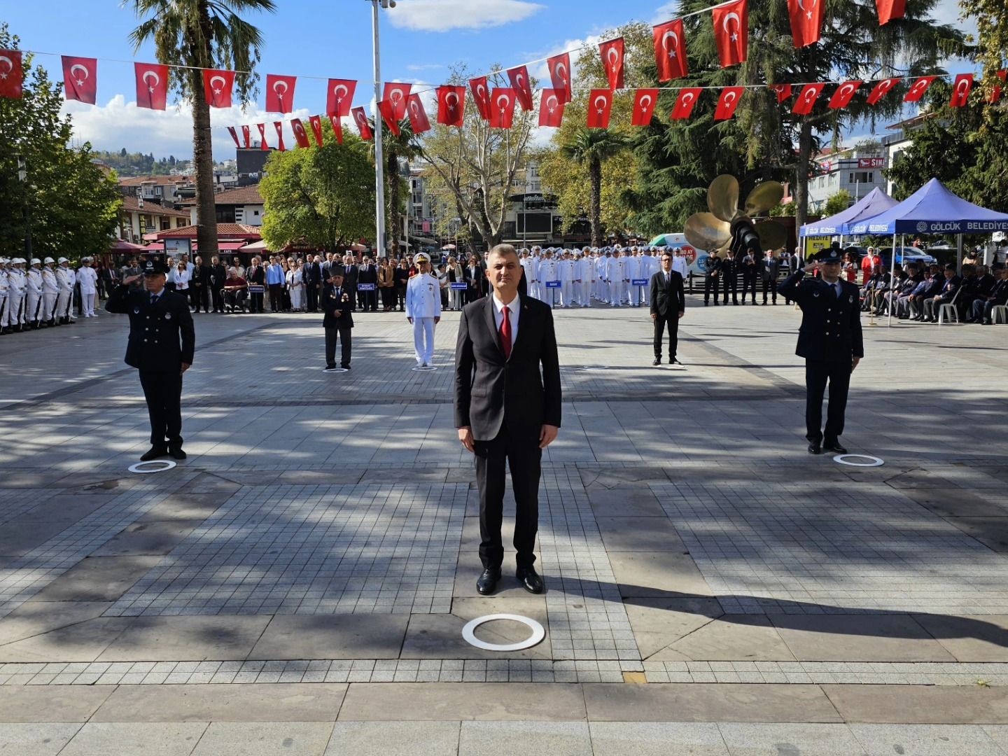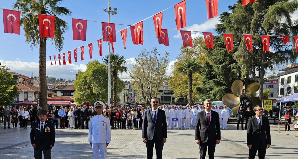 Tören; Gölcük Kaymakamı Müfit Gültekin, Gölcük Deniz Ana Üs ve Garnizon Komutanı Tuğamiral Mehmet Özgür Özömek, Gölcük Belediye Başkanı Ali Yıldırım Sezer, Türkiye Muharip Gâziler Derneği Gölcük Şubesi Başkanı Mehmet Arslan’ın Atatürk Anıtına çelenk sunumları ile başladı. Törende daha sonra saygı duruşu ve akabinde de; İstiklal Marşı’nın okunması sonrasında günün anlam ve önemini belirten konuşmalar yapıldı.