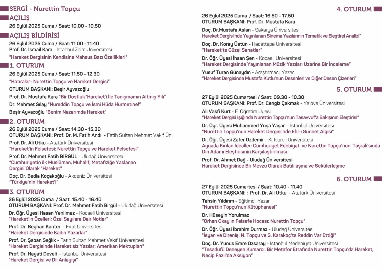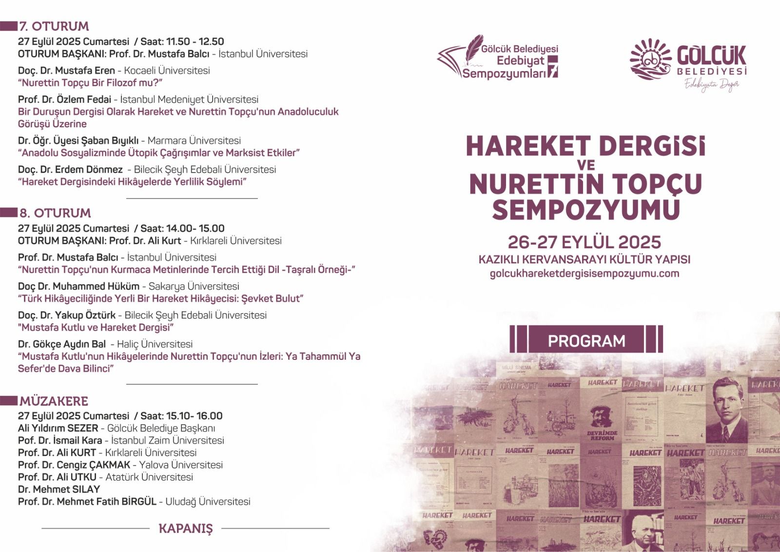 Gölcük Belediye Başkanı Ali Yıldırım Sezer'in açılış konuşmasıyla başlayacak olan sempozyumda akademisyenler, yazarlar ve araştırmacılar, ünlü düşünür Nurettin Topçu ve onun kurucusu olduğu Hareket Dergisi'ni farklı yönleriyle ele alan bildiriler sunacak.