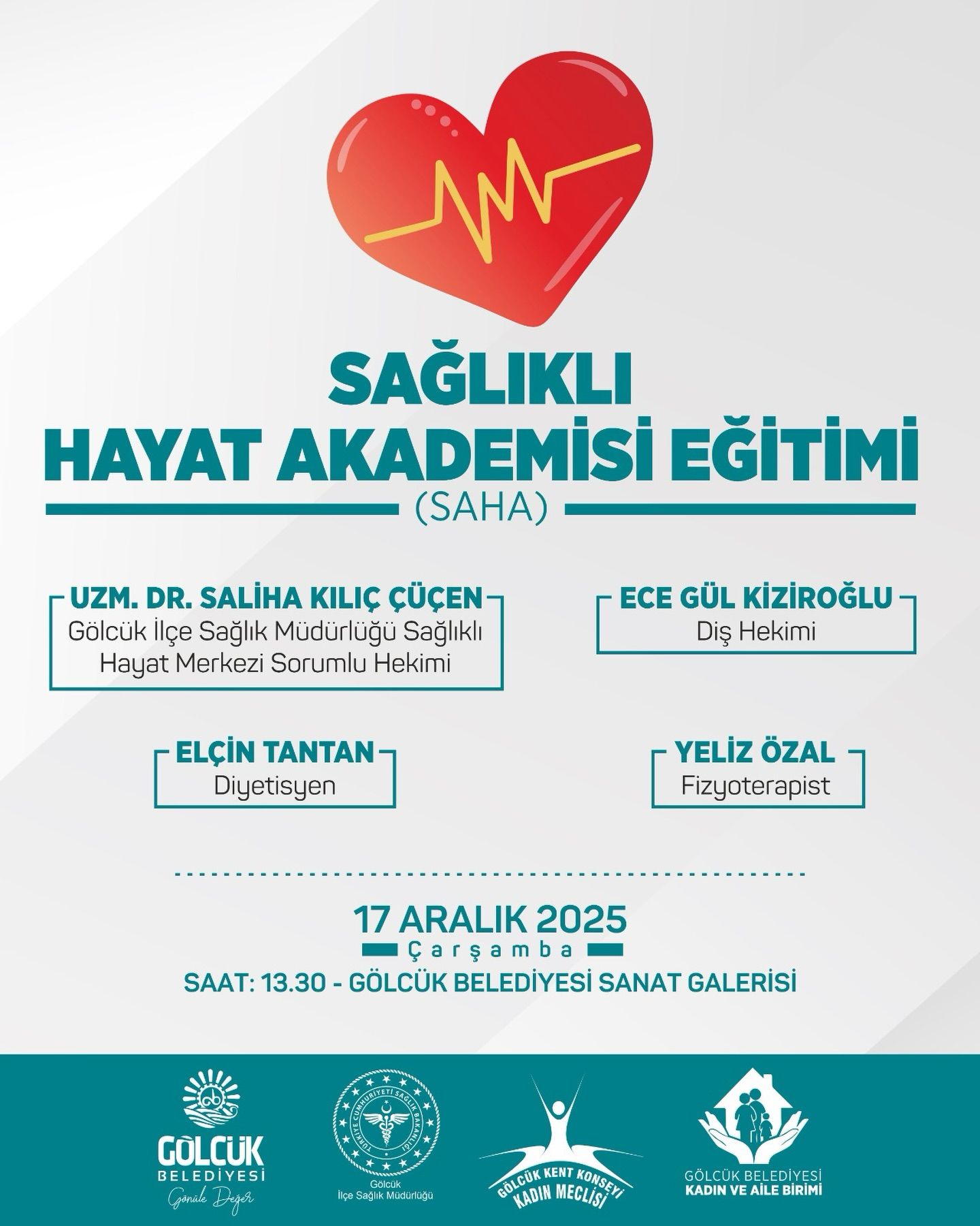Gölcük Belediyesi, ilçe halkının sağlıklı yaşama dair farkındalığını artırmak amacıyla eğitimlere devam ediyor. Bu kapsamda yapılan etkinlikler; 17 Aralık Çarşamba günü Gölcük Belediyesi Sanat Galerisi’nde gerçekleştirilecek, "Sağlıklı Hayat Akademisi (SAHA) Eğitimi" ile sürecek. Saat 13.30’da başlayacak olan eğitimde, Gölcük İlçe Sağlık Müdürlüğü Sağlıklı Hayat Merkezi Sorumlu Hekimi Uzm. Dr. Saliha Kılıç Çüçen, katılımcılara genel sağlık ve sağlıklı yaşam prensipleri hakkında önemli bilgiler aktaracak.
