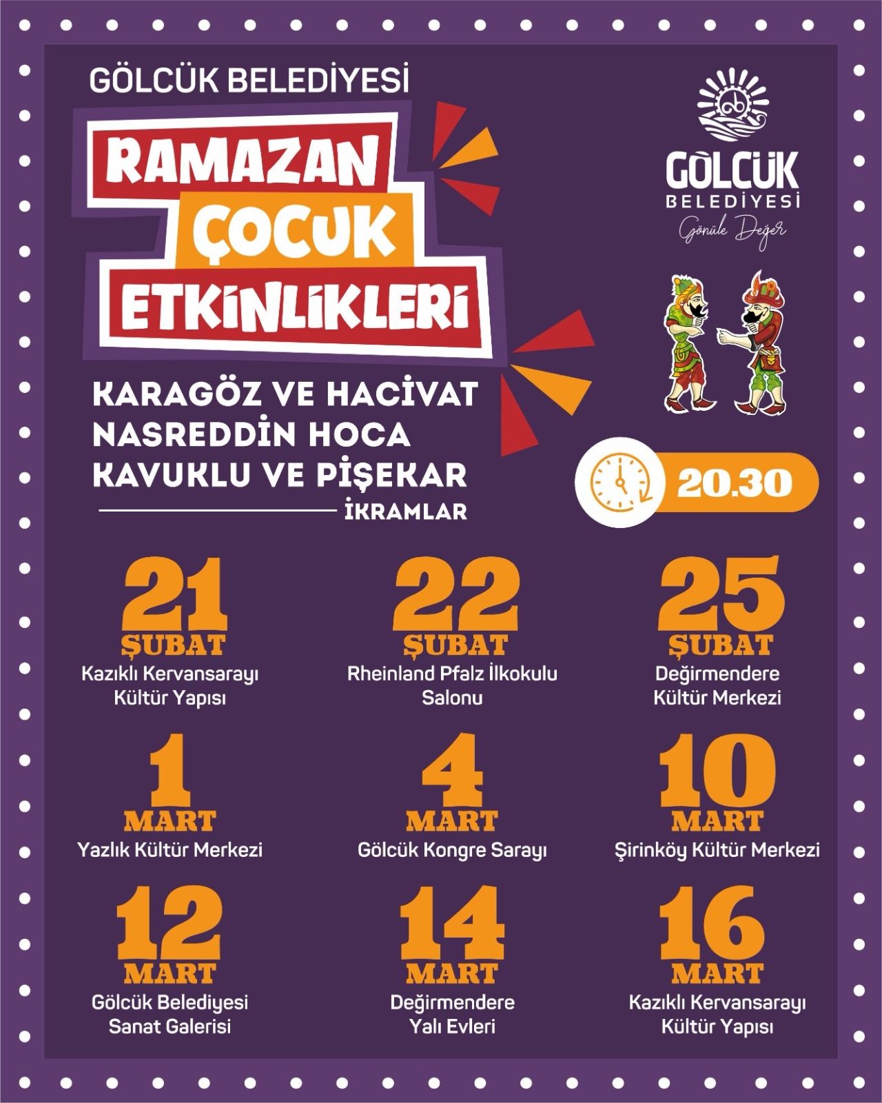 Tüm çocukları ve ailelerini bu geleneksel coşkuya ortak olmaya davet eden Gölcük Belediye Başkanı Ali Yıldırım Sezer, “Ramazan ayının o güzel maneviyatını ve neşesini hep birlikte yaşamak için geleneksel çocuk etkinliklerimizi başlatıyoruz. Kültürel mirasımızın en renkli kahramanlarıyla buluşacağımız bu eğlenceli akşamlara hepinizi bekliyorum” dedi.