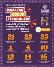 Mart ayı boyunca da hız kesmeden sürecek olan etkinlikler, 1 Mart’ta Yazlık Kültür Merkezi, 4 Mart’ta Gölcük Kongre Sarayı ve 10 Mart’ta Şirinköy Kültür Merkezi’nde çocuklarla buluşacak. Ramazan neşesi, 12 Mart’ta Gölcük Belediyesi Sanat Galerisi ve 14 Mart’ta Değirmendere Yalı Evleri’ndeki programlarla devam ederken; büyük final 16 Mart tarihinde yeniden Kazıklı Kervansarayı Kültür Yapısı’nda gerçekleştirilecek.