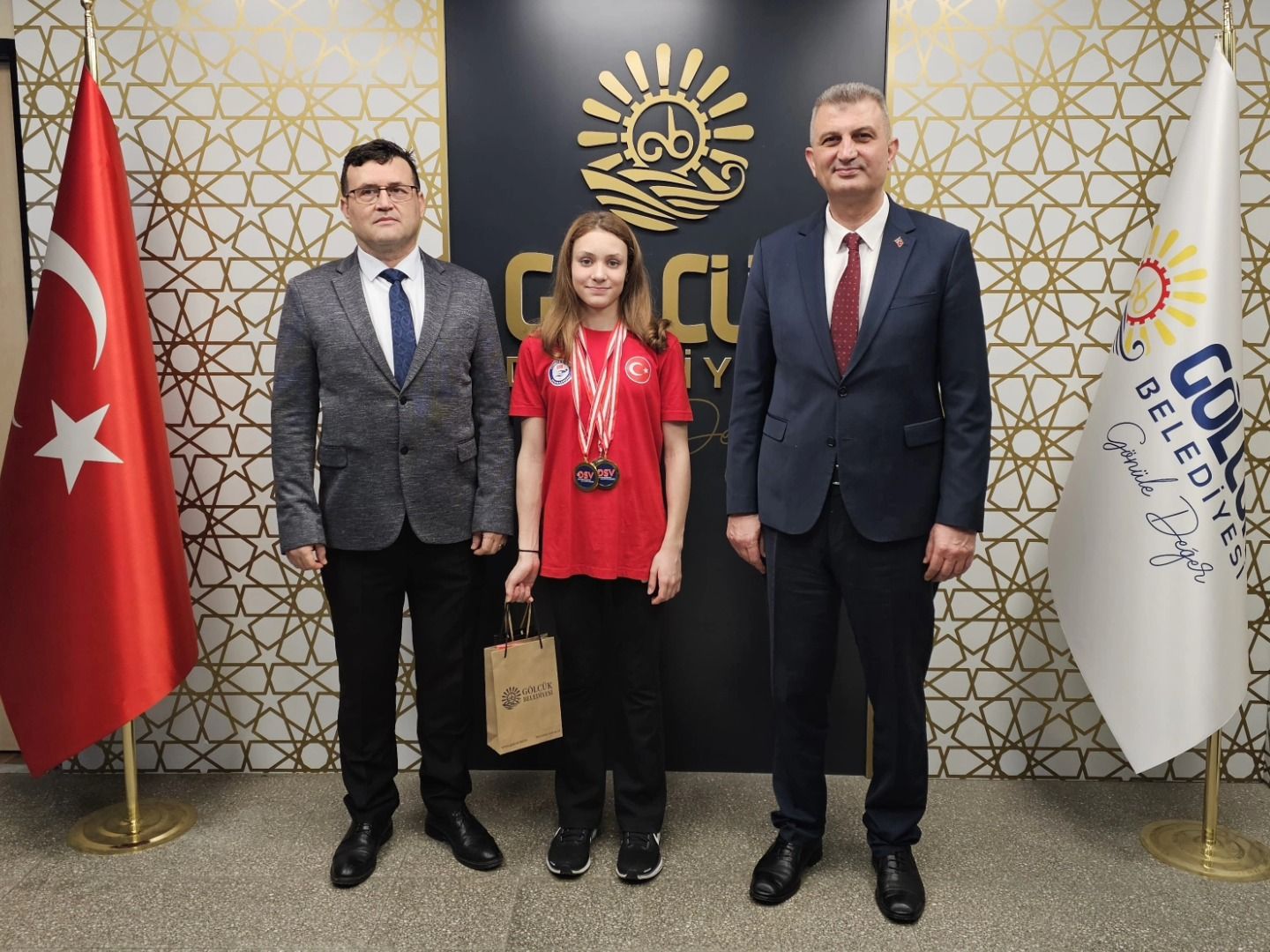 Uluslararası arenada kazandığı başarıyla ay-yıldızlı bayrağı kürsünün en üst basamağına taşıyan Alara Gökalp, yurda dönüşünde babası Burak Gökalp ile birlikte Gölcük Belediye Başkanı Ali Yıldırım’ı ziyaret etti. Başarılı sporcuyu makamında ağırlayan Başkan Sezer, genç yüzücünün elde ettiği bu büyük başarıdan duydukları memnuniyeti dile getirdi.